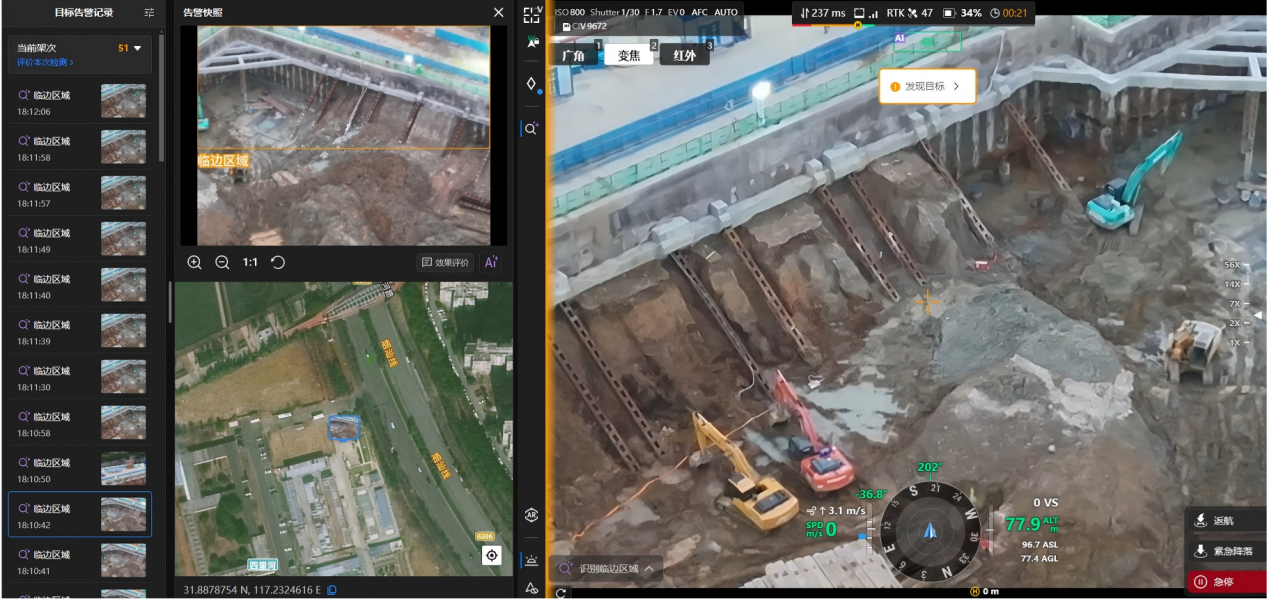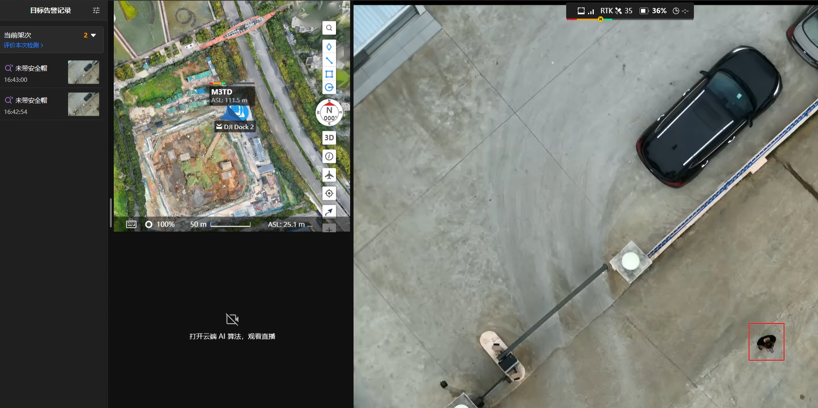 該項(xiàng)目部署具備定時(shí)自主飛行與實(shí)時(shí)傳輸能力的無人機(jī)機(jī)場(chǎng)系統(tǒng),結(jié)合AI算法引擎實(shí)現(xiàn)施工現(xiàn)場(chǎng)精度還原與目標(biāo)智能感知。在安全管理方面,無人機(jī)按預(yù)設(shè)航線自動(dòng)巡檢或遠(yuǎn)程操控,實(shí)時(shí)回傳畫面,AI大模型視覺算法可自動(dòng)識(shí)別未帶安全帽、臨邊區(qū)域等隱患,觸發(fā)告警并記錄目標(biāo)信息,助力管理人員快速排查處置,擴(kuò)大巡查范圍、縮短隱患處置時(shí)間,提升安全管理效率。